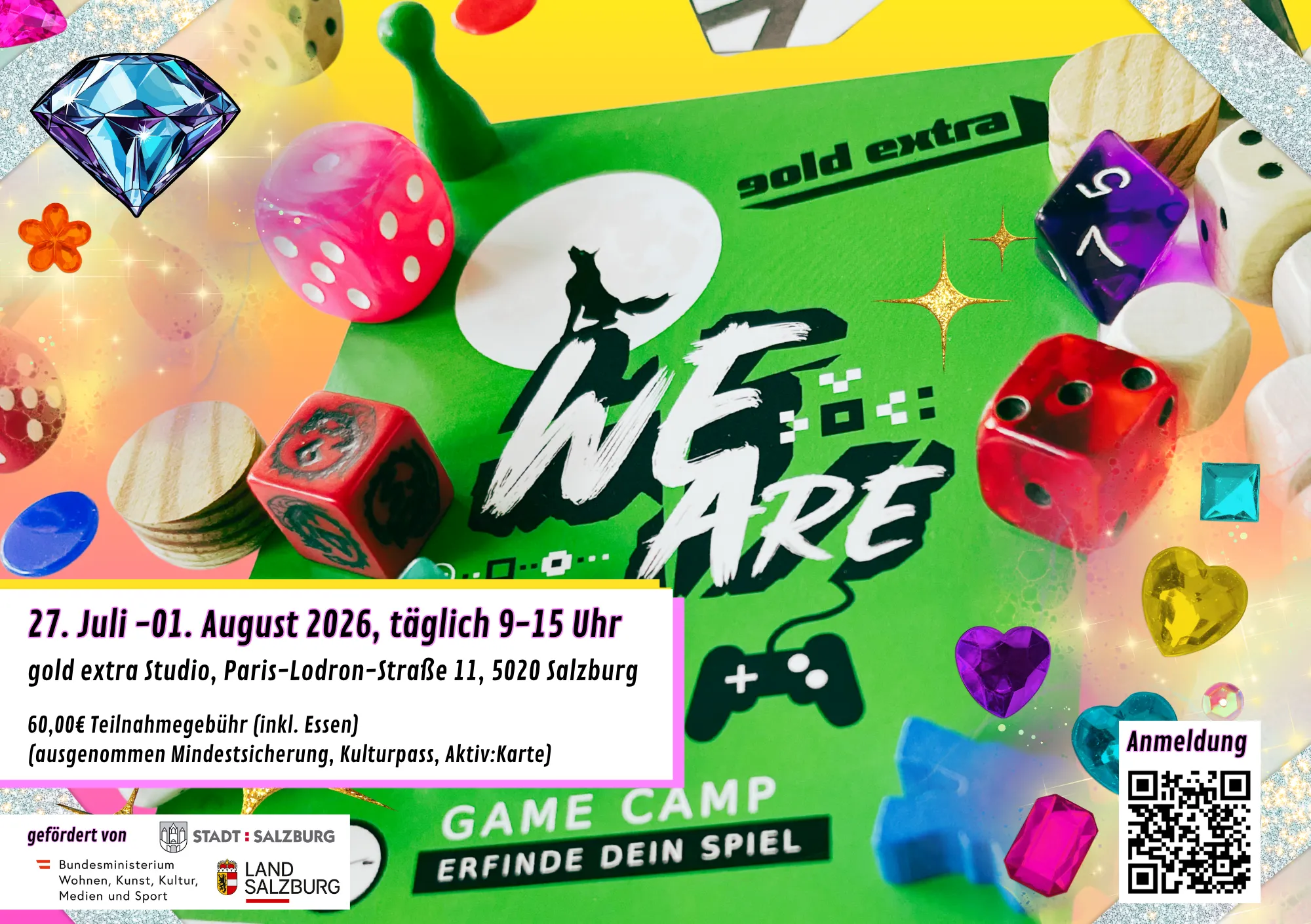 Das WE ARE Game Camp findet heuer täglich von 9 bis 15 Uhr (Montag bis Samstag) im gold extra Studio in der Paris-Lodron-Straße 11 (5020 Salzburg) statt. Die Teilnahme kostet 60,00 € und ist für Familien mit Mindestsicherung, Kulturpass, Aktiv:Karte KOSTENLOS. Wir sorgen auch für ausreichend (gesunde) Snacks, ein leckeres Mittagessen und genügend (Bildschirm-)Pausen!